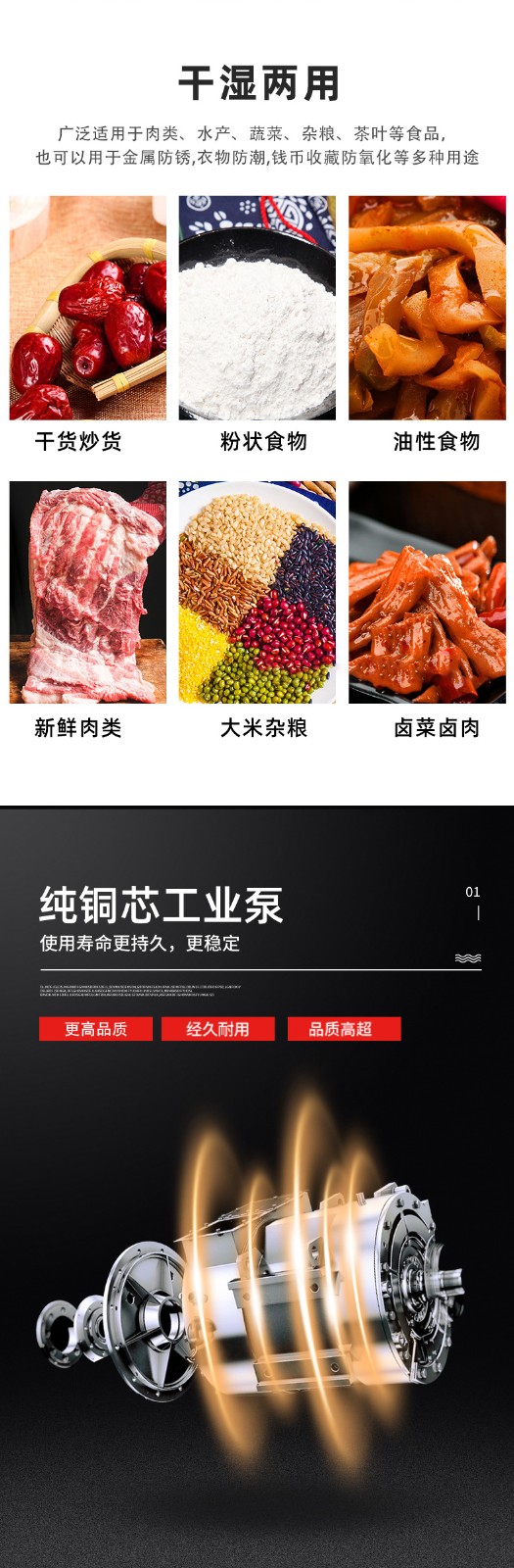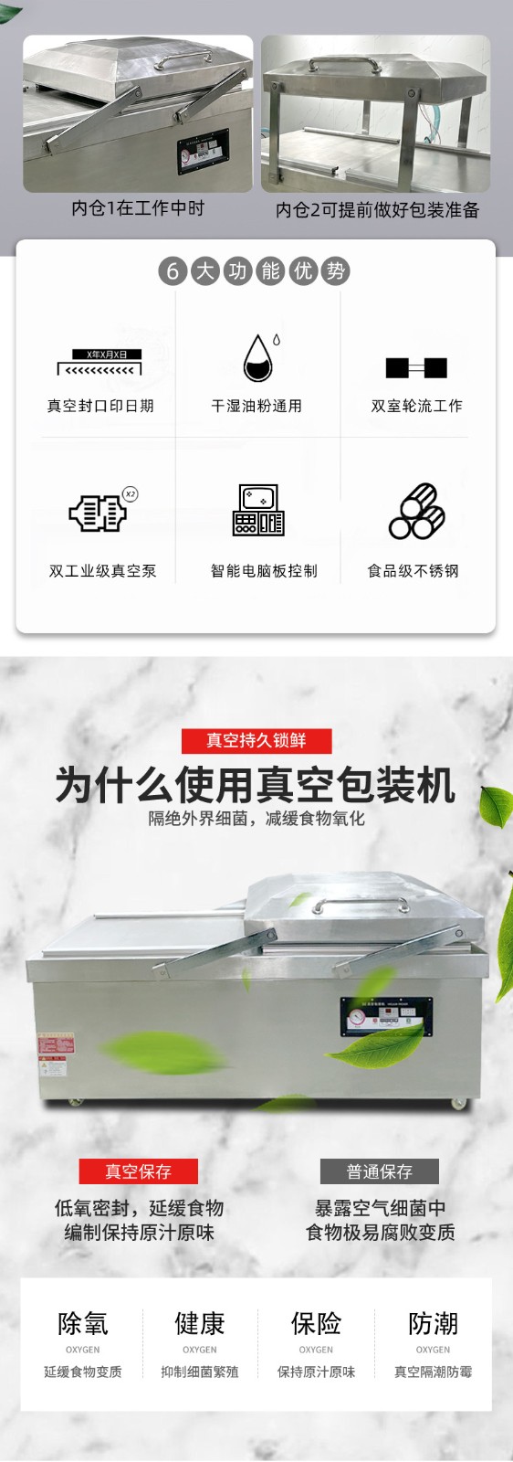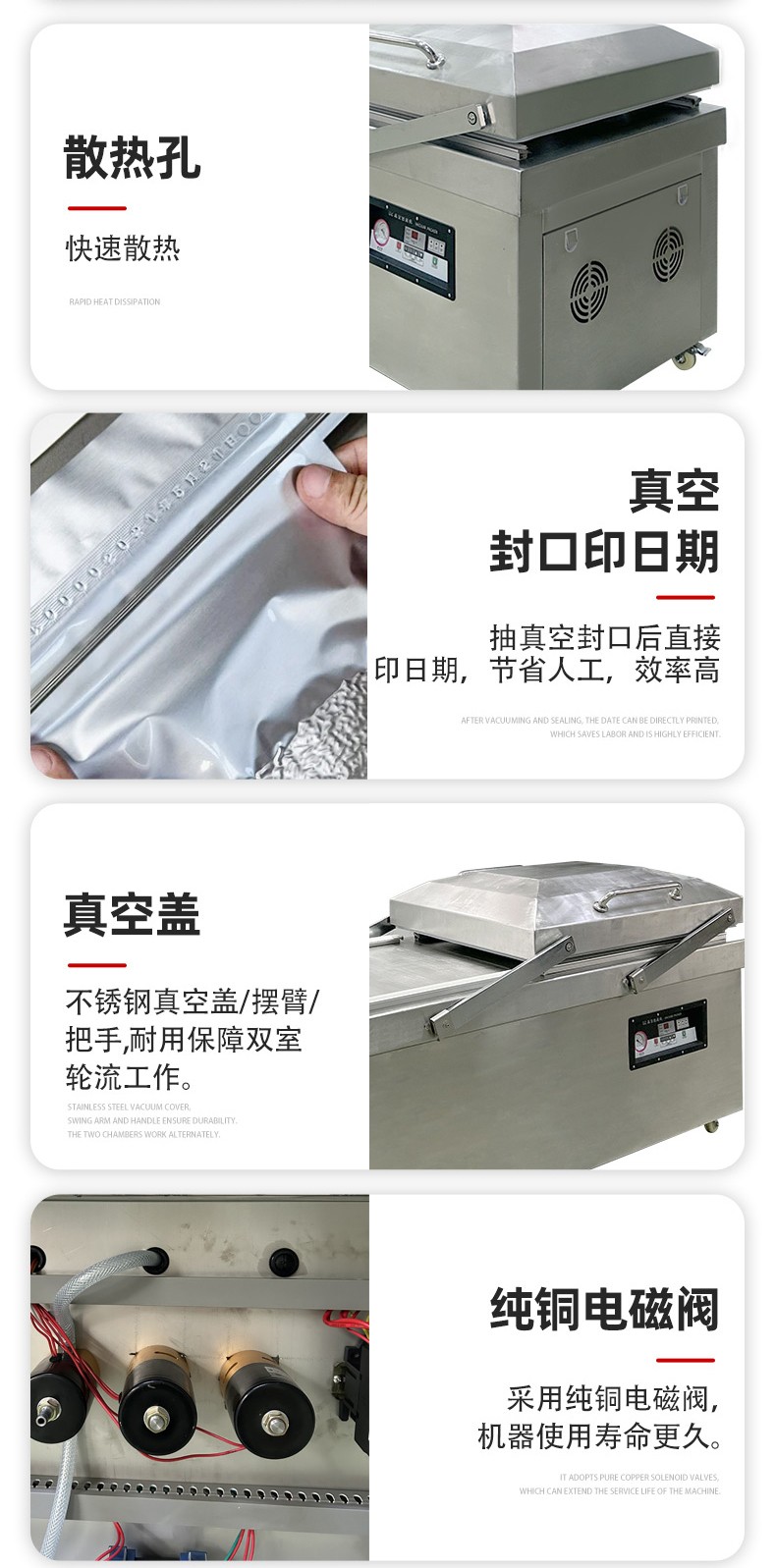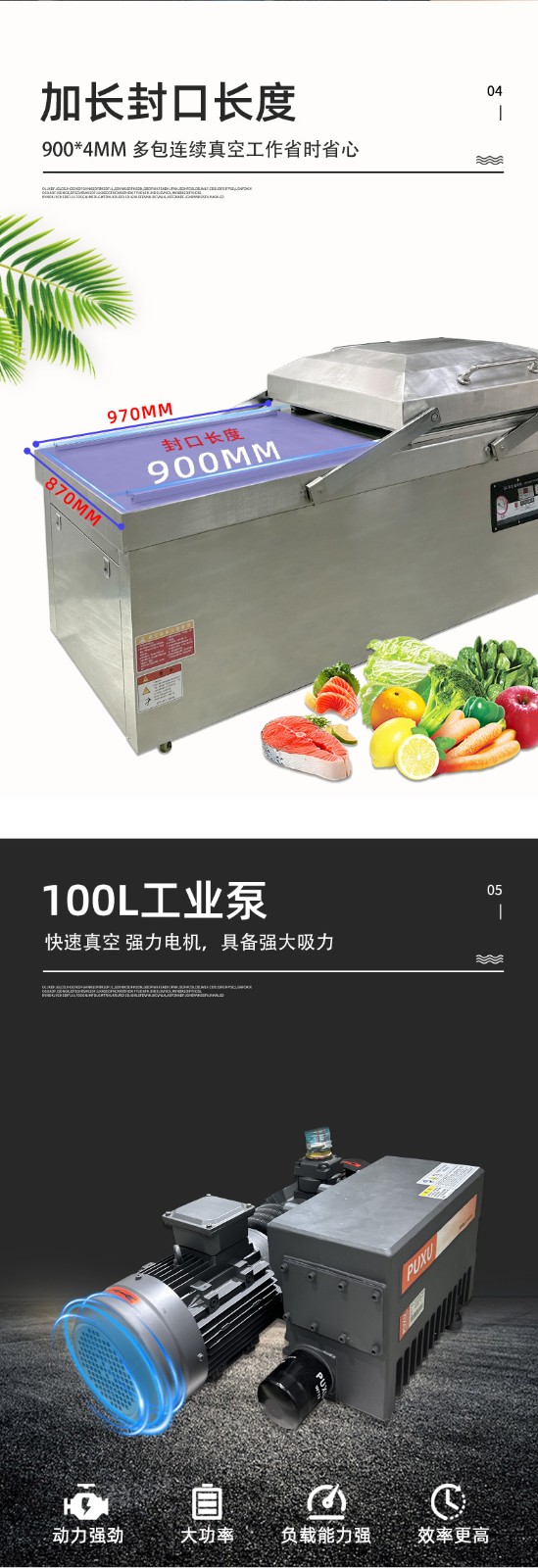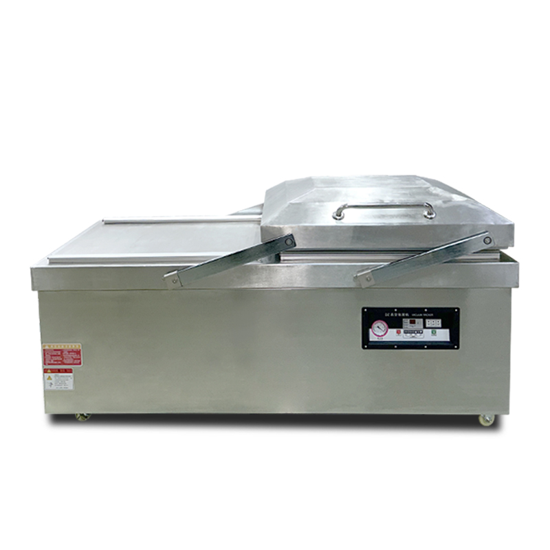 Practical Benefits in Mass Production: In continuous mass production scenarios, this alternating mode can increase the "effective working time ratio" of the equipment to over 80% (single-chamber machines typically only reach 50%-60%). For example, packaging a standard-sized piece of meat takes about 15 seconds per cycle with a single-chamber machine, completing a maximum of 240 cycles per hour. In contrast, through alternating operations, a dual-chamber machine can reduce the "actual time per cycle" to 8-10 seconds (while one chamber is pumping vacuum, the other synchronously completes material placement and preparation), stably achieving 360-450 cycles per hour—an efficiency improvement of over 50%. For food processing plants, meat slaughterhouses, and other facilities requiring high-frequency packaging, this efficiency boost can directly reduce the number of equipment investments, lower labor costs, and minimize space occupation.