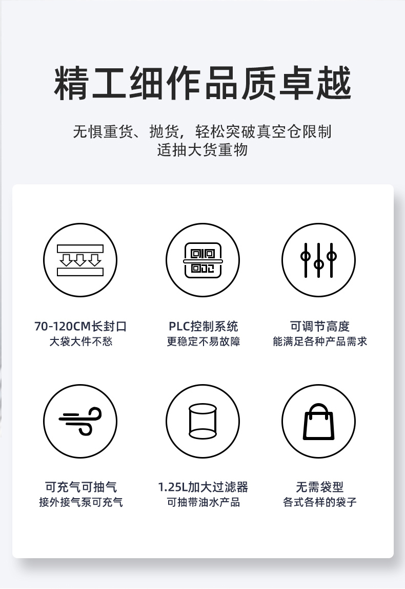 - Efficient Air Suction and Sealing System: Adopting a double-cylinder and double-air-nozzle structure, it achieves faster air suction (and inflation) speeds. Compared with the single-air-nozzle structure, its work efficiency can be significantly improved. In addition, the sealing adopts a pneumatic type, and the heat-sealing strip heats evenly, ensuring firm sealing. It can complete the sealing operation in a short time, further enhancing packaging efficiency.
