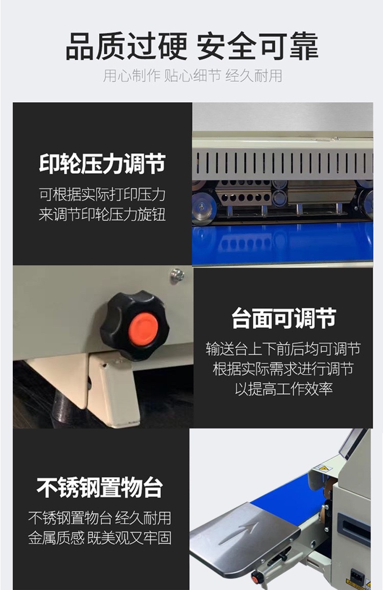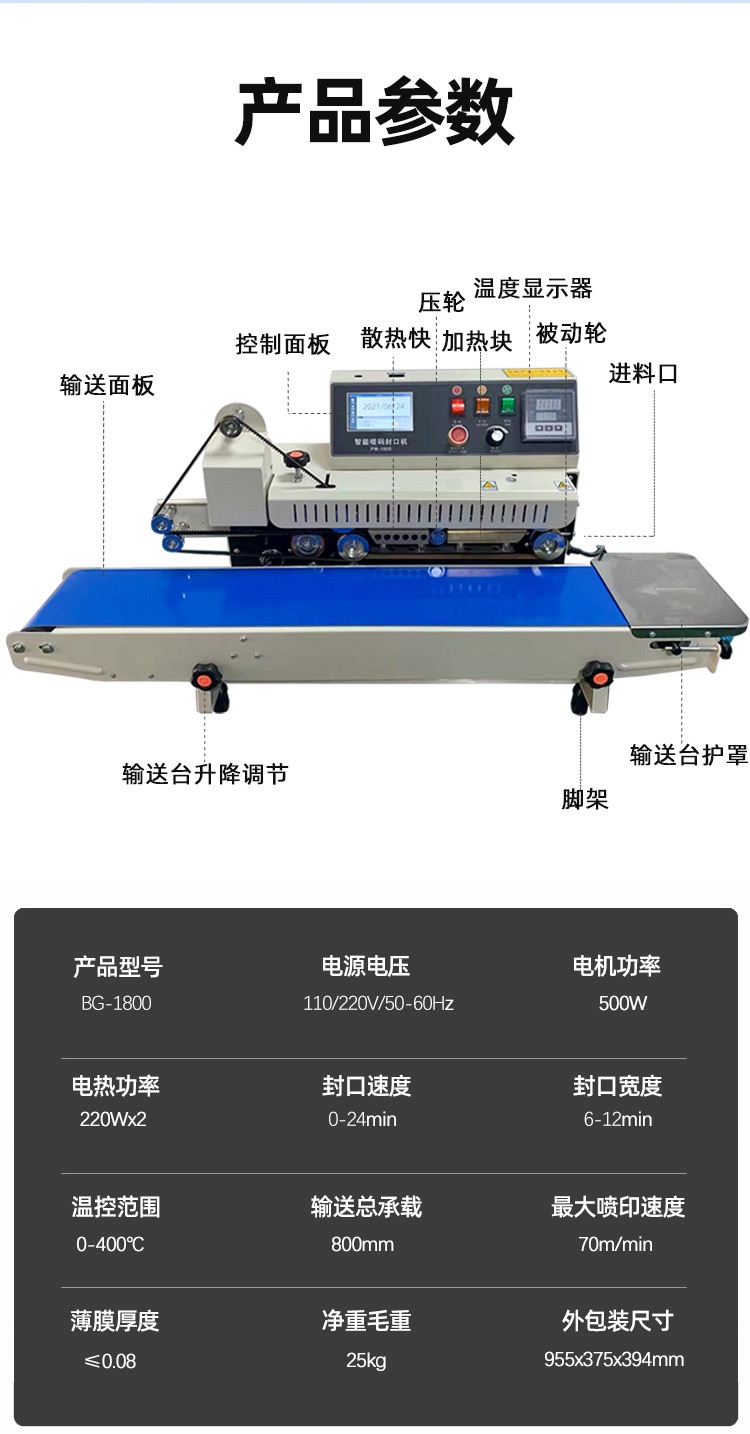 The equipment is equipped with flexibly adjustable conveying rails, sealing mechanisms, and inkjet head brackets. For example, when dealing with packaging bags (ranging from mini snack bags with a width of <10cm to large express bags with a width of >50cm), operators only need to set parameters via knobs or touch screens. The conveying rails will automatically adjust their width to stably transport the packages; the sealing heating blocks can move up and down according to the height of the packages; and the inkjet heads can be fine-tuned forward, backward, left, and right. This ensures that inkjet coding and sealing act accurately on the edges or designated areas of packages of different sizes.