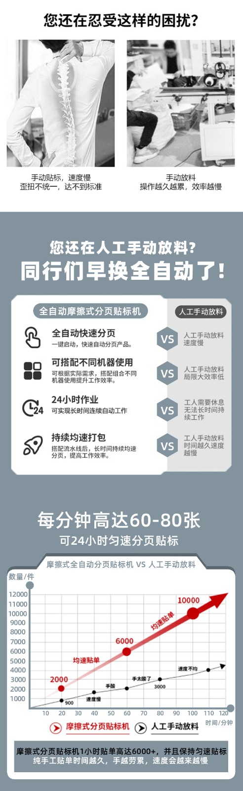Labeling speeds vary significantly across different machine types (e.g., 分页贴标机 sheet-feeding labeling machines, 平面贴标机 flat-surface labeling machines, 圆瓶贴标机 round-bottle labeling machines). For mainstream industrial-grade equipment, the labeling speed typically ranges from 50 to 300 pieces per minute. For instance, sheet-feeding labeling machines designed for flat products like medicine boxes and cards can achieve a stable speed of over 200 pieces per minute; high-speed models for small-sized products (such as electronic components) can even exceed 300 pieces per minute.