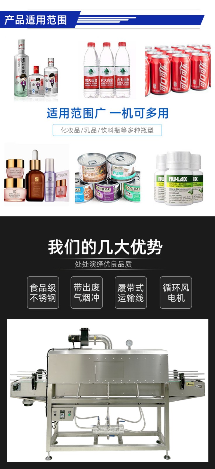 It uses a conveyor belt to transport products into the heating area at a constant speed, ensuring that all parts of the product stay in the heating area for the same duration. This avoids uneven shrinkage effects caused by local uneven heating (the speed of the conveyor belt can be adjusted according to the product size and film type).