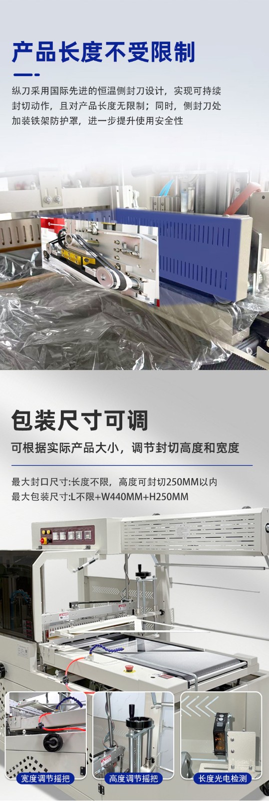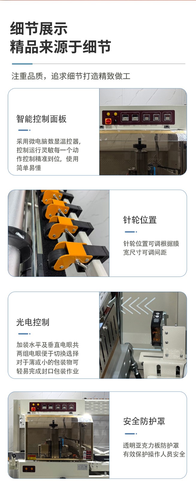 • Precision Detection Photoelectric Sensor: Equipped with imported detection photoelectric sensors, including one set each for horizontal and vertical detection, which is convenient for switching and selection. It can accurately detect the position and size of the product, and can easily complete the sealing and packaging operation even for thin and small packages, ensuring the accuracy of the sealing-cutting position and thus realizing centered sealing.