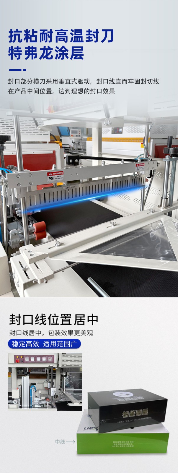 • Vertically Driven Sealing-Cutting Knife Holder: The sealing-cutting knife holder is controlled by vertical drive, such as a four-column vertical system drive. It can solve the problems of wrinkles and the sealing line not being in the middle of the product that occur in traditional L-type sealing machines, enabling the sealing line to be accurately located in the middle of the product and ensuring the aesthetics and firmness of the seal.