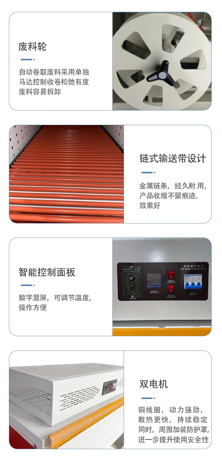 • Intelligent Control System: Through the combination of PLC (Programmable Logic Controller) and photoelectric detection technology, the equipment can accurately adjust the film length and sealing-cutting position. The addition of a timer further optimizes the action sequence, avoids time waste caused by rhythm disorder, and ensures the efficient and stable progress of the packaging process.