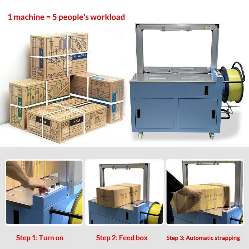 Semi-automatic strapping machine: Its efficiency is relatively low because manual strap placement takes time and manual operation speed is limited in continuous work. It is more suitable for situations with small strapping volume and low speed requirements, such as small enterprises, shops or household use.