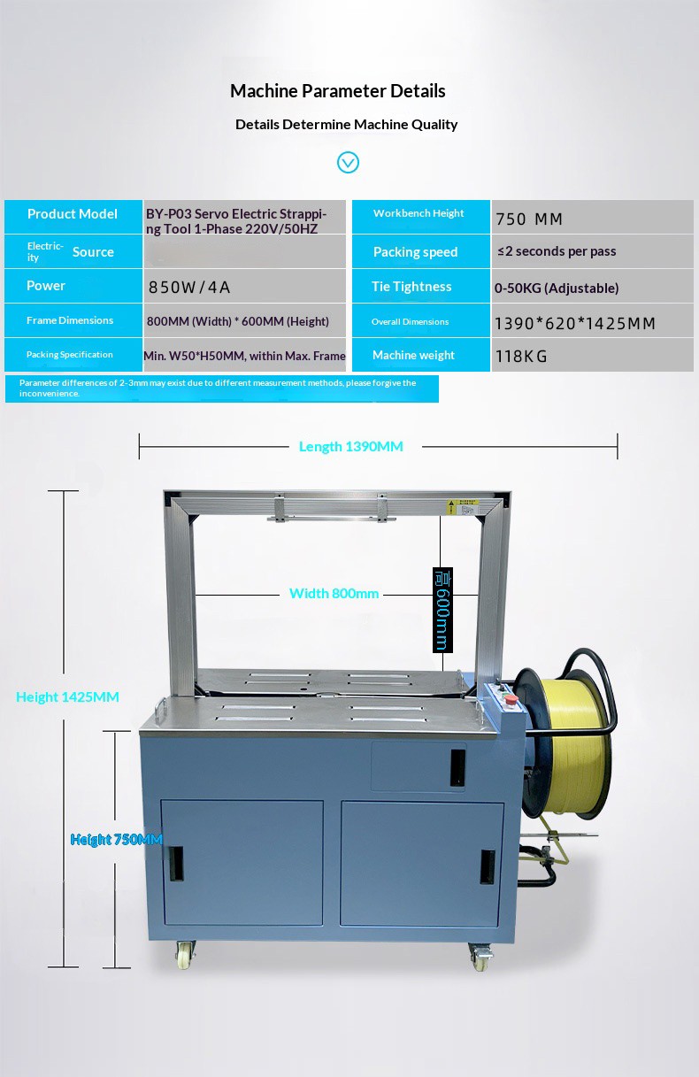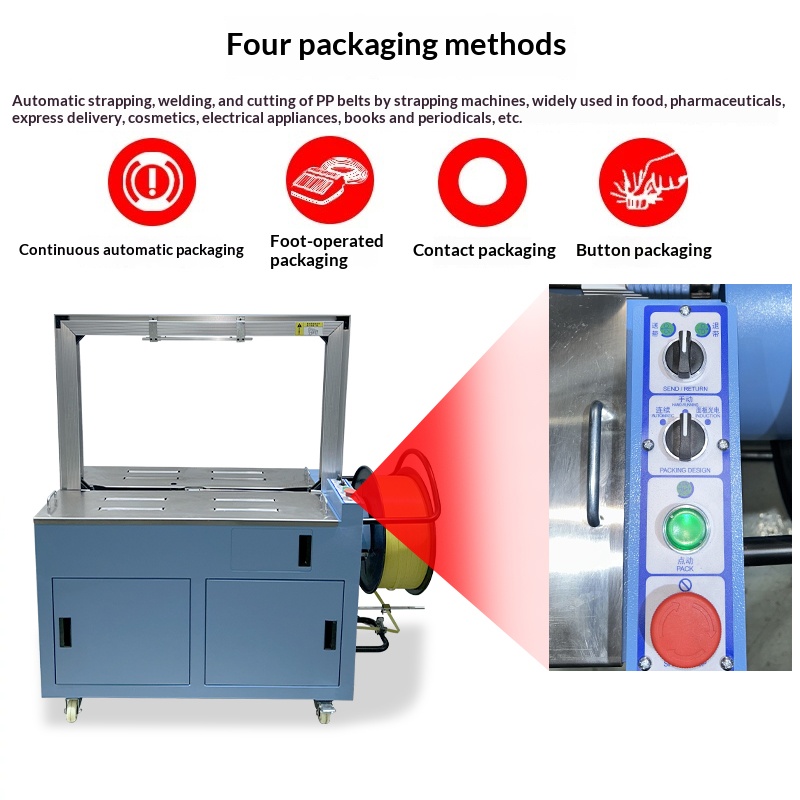 Semi-automatic strapping machine: Manual participation is required in some steps. The operator usually wraps the strapping band around the item and places it at a specific position on the machine, then starts the machine to complete tensioning, sealing and cutting.