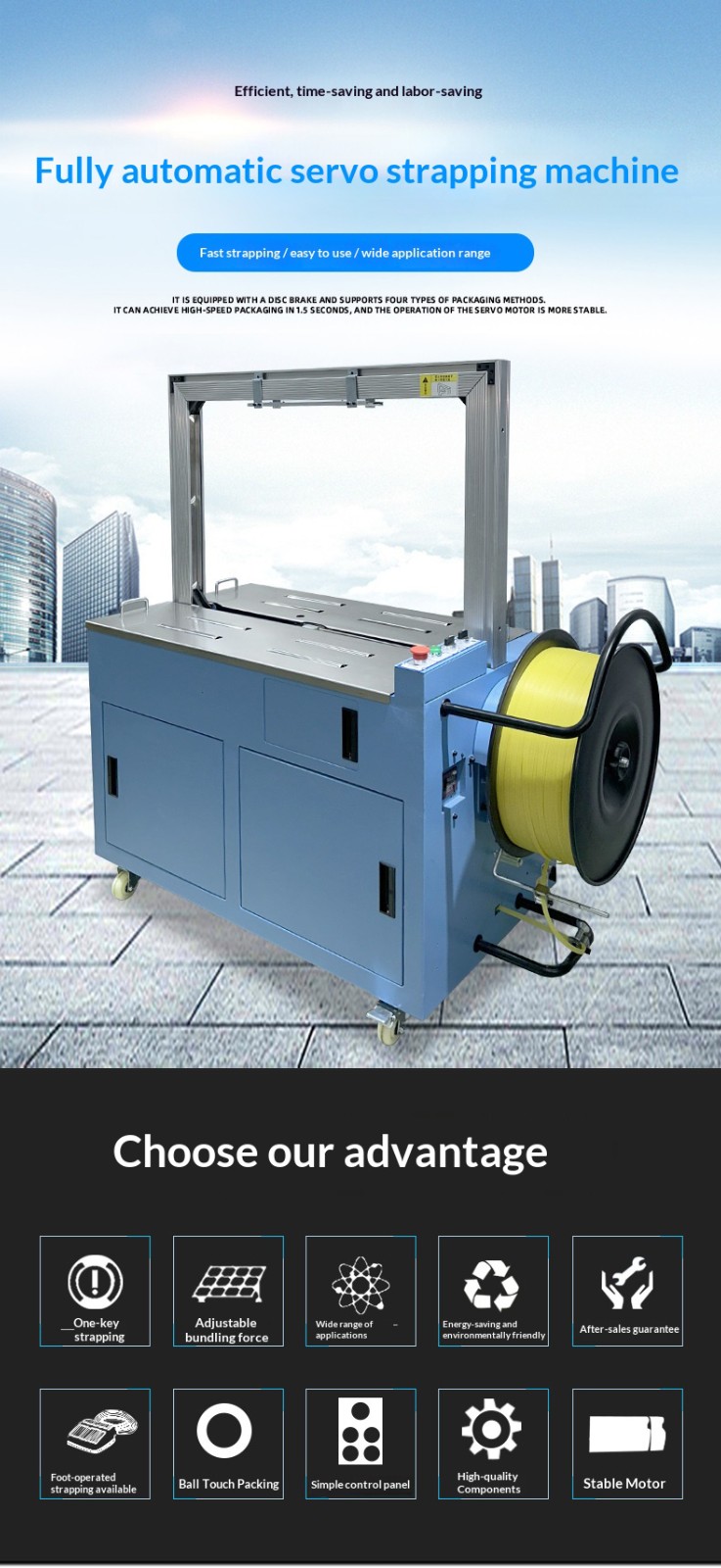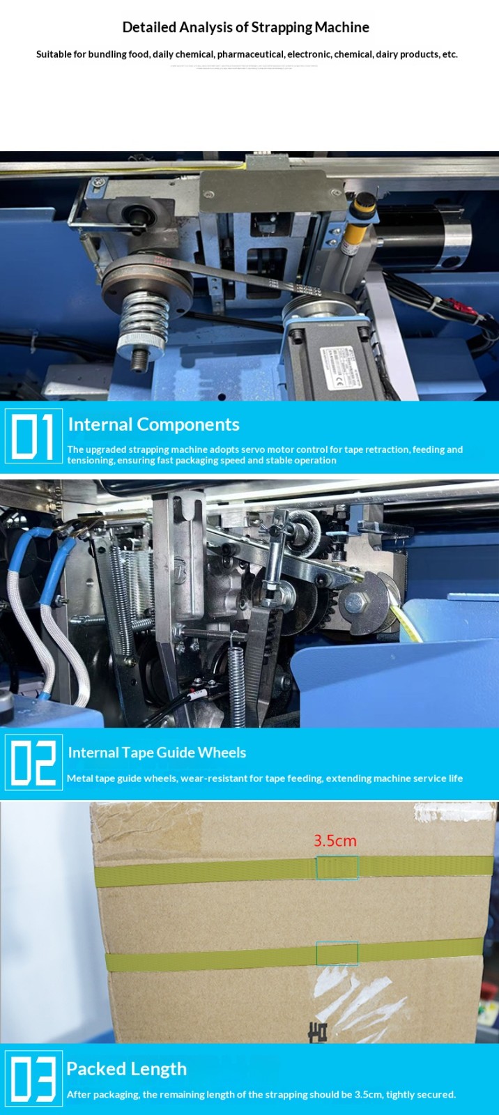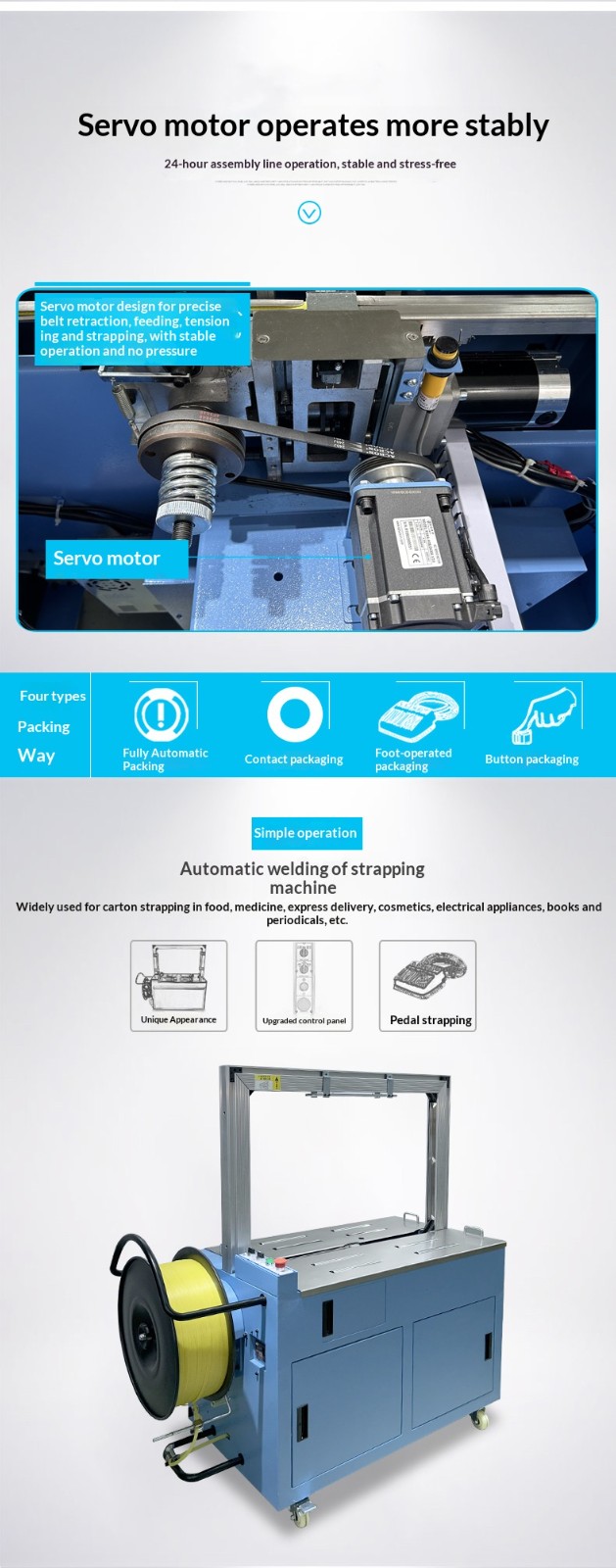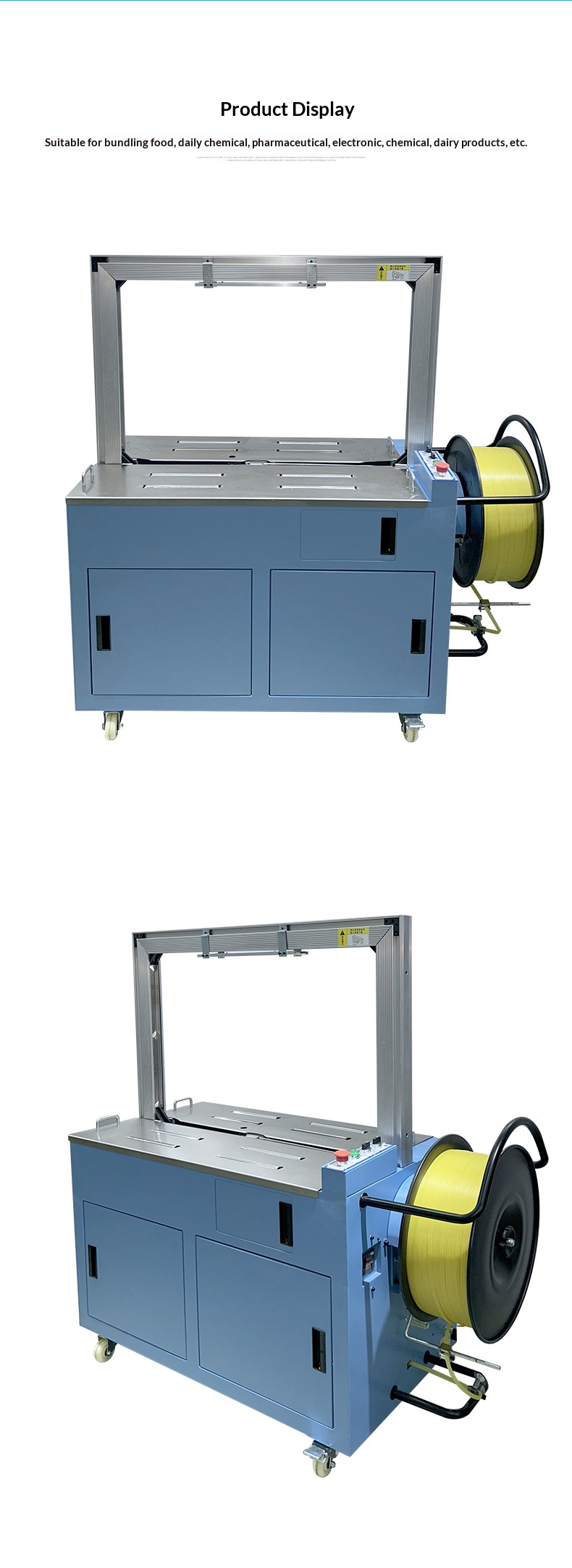 Application ScenariosFully automatic strapping machine: Suitable for various large-scale production enterprises, logistics and distribution centers, e-commerce warehouses, etc. These places need to handle a large number of strapping tasks every day with high requirements for efficiency and consistency, so that the advantages of fully automatic strapping machines can be fully utilized to improve work efficiency and reduce labor costs.