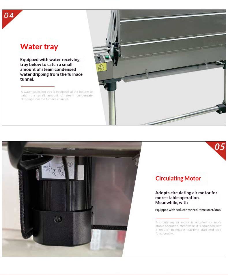 Classified by heating mode: There are quartz tube heating, stainless steel tube heating, far infrared heating, etc. Quartz tube heating features fast temperature rise and high thermal efficiency; stainless steel tube heating is durable with long service life; far infrared heating enables simultaneous heating of the interior and surface of objects, with good shrinkage effect.